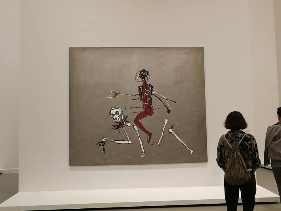 L’exposition Basquiat se termine sur un tableau saisissant au titre explicite, « Riding With Death » (chevaucher avec la mort). Sur un fond étonnamment nu, un personnage chevauche un squelette. Basquiat l’a peint en 1988, l’année de sa mort.